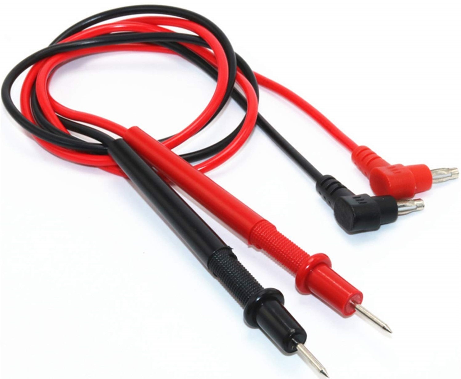 The black and red multimeter test leads feature sharp contact ends designed for precise measurements on small electronic components such as ICs. Compatible with universal multimeters, they support a maximum current of 10A and test voltages up to 1000V, ensuring versatile use for various electrical testing tasks. With an approximate 21mm plug insertion depth, these leads provide secure connections and reliable performance for accurate diagnostics.