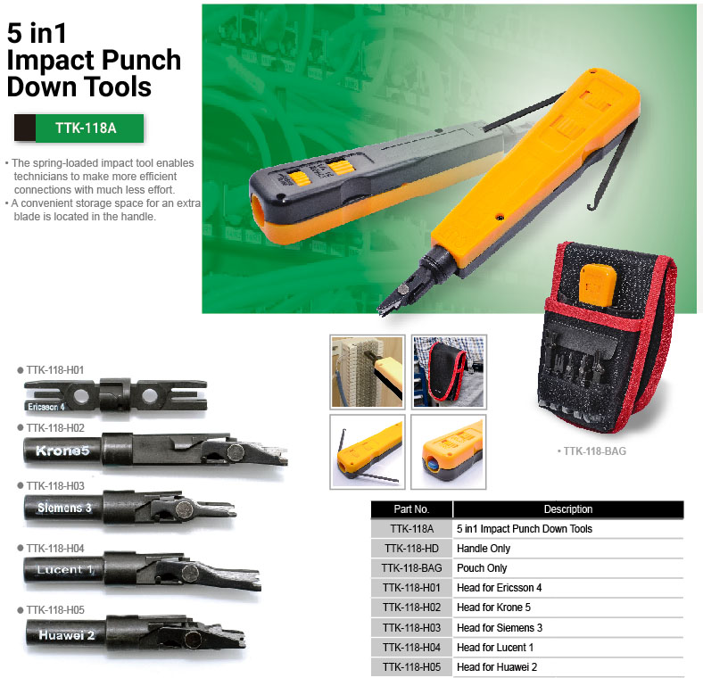 The Goldtool 5 in 1 TTK-118A Impact Punch Down Tool with Multiple Insertion Blade Heads is a spring-loaded impact tool that enables technicians to make more efficient connections with much less effort. A convenient storage space for an extra blade is located in the handle. Multiple Insertion Blade heads included are for Ericsson, Krone, Siemens, Lucent, Huawei also included is an easy Carry pouch.