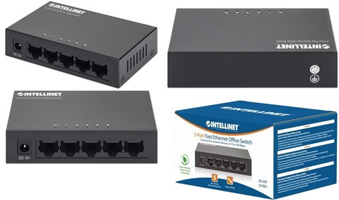 Intellinet 5-Port Fast Ethernet Switch – Metal Case, Desktop,Supports 10Base-T Cat3,4,5 and 100Base-TX Cat5 UTP/STP RJ-45 media. Packet forwarding rates of 148,800 pps (100 Mbps) and 14,880 pps (10 Mbps). Features 48 kBytes buffer memory and 1024 MAC address entries. Utilizes store and forward switching architecture. Certified FCC Class B and CE Mark. Retail Box, 1 year Limited Warranty