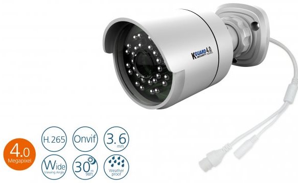 KGuard IPB-400 4.0 Megapixel PoE IP Camera. Image Sensor: 1/3″ Megapixels CMOS Sensor with IR Cut Filter . Max. Resolution: 4.0MegaPixel (2592×1520) @ 30fps. Lens: 3.6mm fixed . Video Compression: H.265/H.264/MJPEG . Night Vision: 30 meters . ONVIF 2.3 . Waterproof: IP66 , Retail Box, 1 Year Warranty