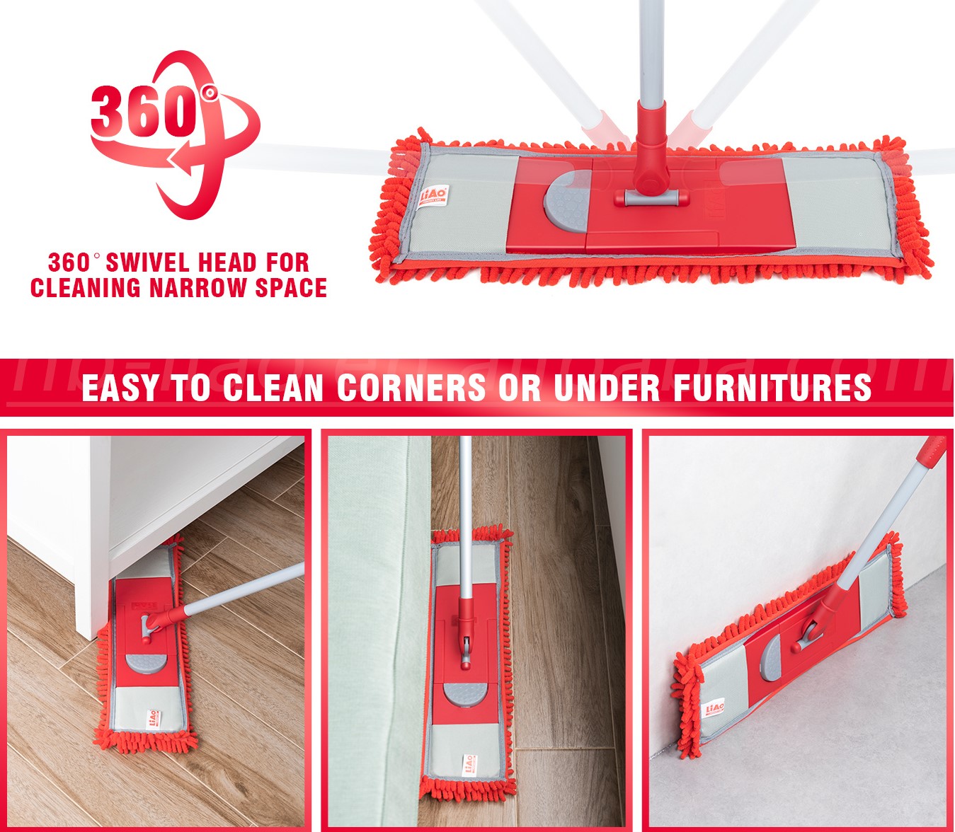 The Kleaner (LiAo) Microfiber Extendable Flat Mop features a telescopic handle and 360° rotating head for versatile wet and dry cleaning on multiple surfaces. Its microfiber and chenille pads attract dust, pet hair, and tough stains, making it ideal for allergy-sensitive homes. Reusable and machine washable, it offers easy one-click pad removal for convenient maintenance.