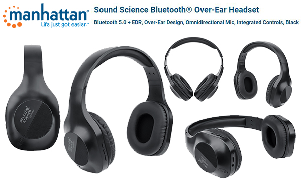Manhattan Sound Science Bluetooth Over-Ear Headset – Bluetooth 5.0 + EDR, Over-Ear Design, Omnidirectional Mic, Integrated Controls, Black, Retail Box , 1 year Limited Warranty