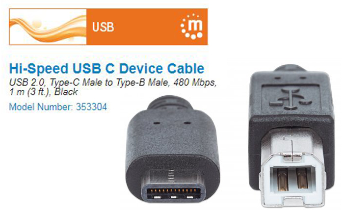 Manhattan Hi-Speed USB C Device Cable – USB 2.0, Type-C Male to Type-B Male, 480 Mbps, 1 m (3 ft.), Black, Retail Box, Limited Lifetime Warranty.