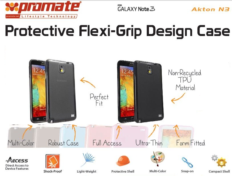 Promate Akton N3 Protective flexi-grip case for Samsung Galaxy Note 3-Grey, Retail Box, 1 Year Warranty