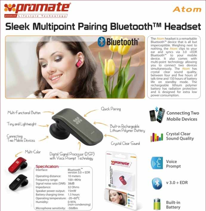Promate Atom Sleek Multipoint Pairing Bluetooth 3.0 Headset/Earphone-Black, Retail Box, 1 Year Warranty