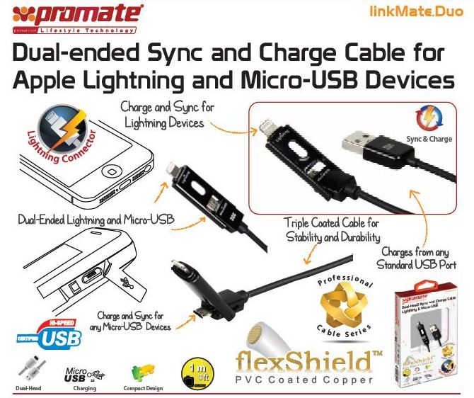 The Promate linkMate.Duo is a compactly designed dual-ended cable offering a simple solution for charging or syncing devices with different connector points. With its collapsible cable tip you can select either Lightning connector or Micro-USB prong. The linkMate.Duo charges directly from any standard USB port and supports data synching features for a multiple type of devices such as iPhone 5, iPod Touch 5th Gen, iPod Nano 7th Gen, iPad mini and iPad 4th Gen or any Micro-USB compatible device. linkMate.Duo is ideal for user who carries multiple devices and needs an efficient and compact charging tool with a minimum shuffle.