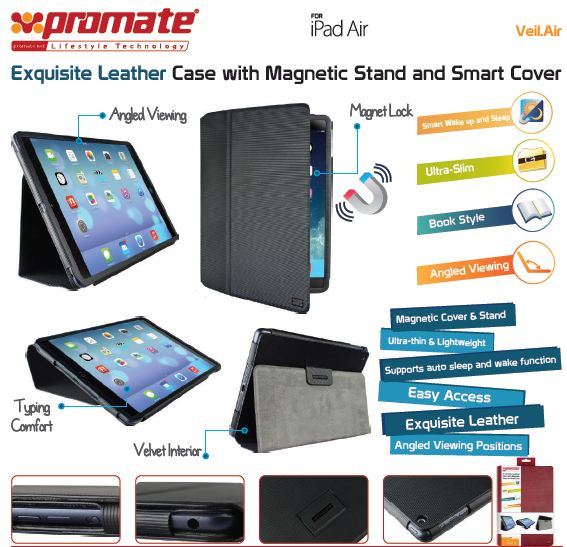 The Promate Veil-Air exquisite leather protective case with magnetic stand and smart cover is crafted using the finest selected leather material, in an elegant book style design; Veil-Air is designed to provide an exquisite level of protection to your iPad Air. The cover folds around the back of the tablet, giving you an integrated stand to make viewing much easier. Position your tablet upright to watch presentations or make video calls, or angle it towards the desk for a more comfortable reading and typing experience. The magnets in the stand ensure stability to your iPad when place upright. The magnetic cover ensures that the iPad is securely held when not in use. Veil-Air is finished with exquisite leather exterior and microfiber interior lining that provides your iPad optimum protection with vivacious styling.