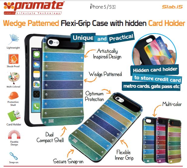 Promate Slab.i5- Wedge Patterned Flexi-Grip Case with hidden card holder-Show off your signature style with Slab.i5, a sleek case for your iPhone 5/5S. Combining luxury with ultimate protection, this fitted flexi-grip snap on case is covered with an easy-to-grip back surface that is richly printed with a modern abstract design. It also features a hidden card holder that may be used to store your credit cards, metro cards, etc. Pleasing to touch, this lightweight and durable custom case allows optimal access to all sensors, ports, and controls on your iPhone 5/5s, while offering superior comfort.