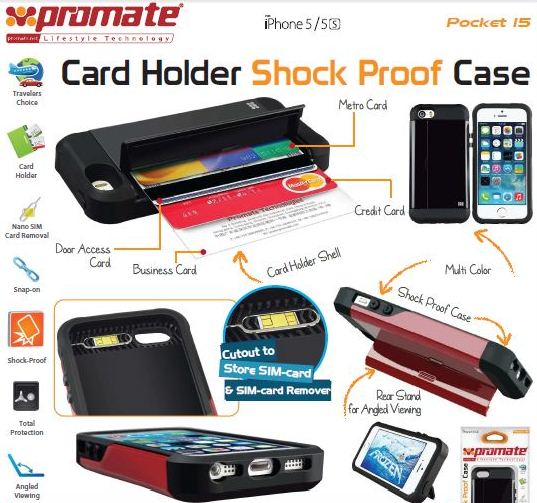 Promate Pocket.i5 Shock Proof rubberized case with an in built card holder for iPhone 5/5s-Grey, Retail Box, 1 Year Warranty