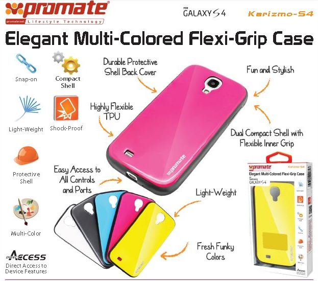 Fun and fully protective flexible case for Samsung Galaxy S4, The Promate Karizmo-S4-Elegant Flexi-Grip Case is allowing you to bring colours combined with fashion and use your phone with style. Featuring direct access to your Smartphone’s ports and secure snap-on back shell design will enhance the look, whilst protecting it from the daily scruffs and scratches.