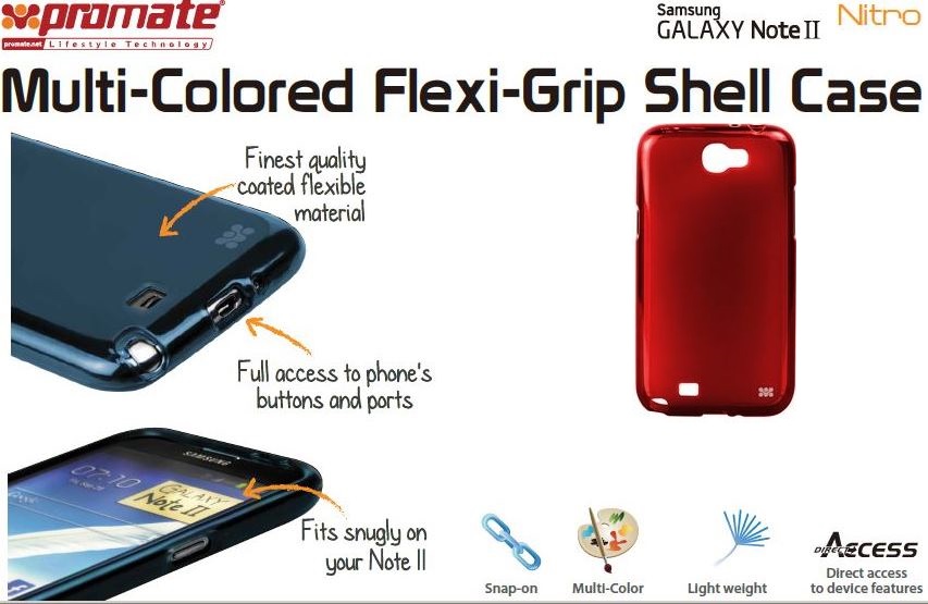 The All-New Promate contemporary case collection for Samsung Galaxy Note II are designed uniquely for both style and durability which incorporates the latest technology for strength and comfort.  Cases fit snugly on the Samsung Galaxy Note II whilst offering full protection from knocks and scrapes; the cases also ensure that you will have complete access to the phone’s external features.  This case collection offer a unique design to match your everyday lifestyle need.