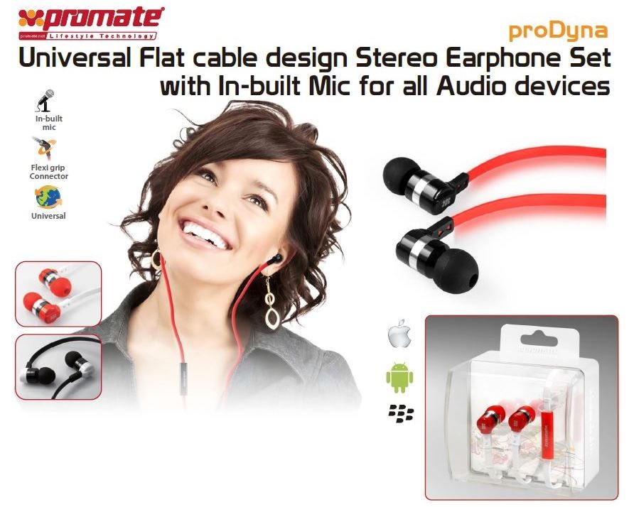 Promate proDyna Universal Flat cable design Stereo Earphone Set with In-built Mic