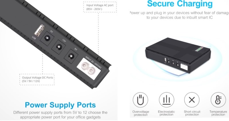 The Solarix (SinyeTech Branded) Micro DC UPS with Built-In 4x High-Capacity Lithium Batteries and Total Capacity of 10400mAH delivers clean, reliable, constant power to various small DC devices such as IP cameras, cordless home phones, and routers during load shedding or when grid power is not available. Unlike a traditional power bank that solely provides backup power when needed, this Micro DC-to-DC UPS remains in line between your device and the power source and modulates the incoming power feed to prevent damage to your sensitive electronic equipment. Switchover to the device is instantaneous when a power outage occurs. , Runs Your Router And Fibre OTN to a maximum of 3-4 Hours during Load Shedding. For extra safety, it also features an intelligent protective design that includes Over-Charge, Over-Discharge, and Short Circuit Protection. Front Ports 1 x 5V USB Ports, 1 x 5V DC Output, 1 x 9V Output Port, 1 x 12V Output Ports as well as a 1x POE and 1x LAN Port. Built-In AC Charger Adaptor