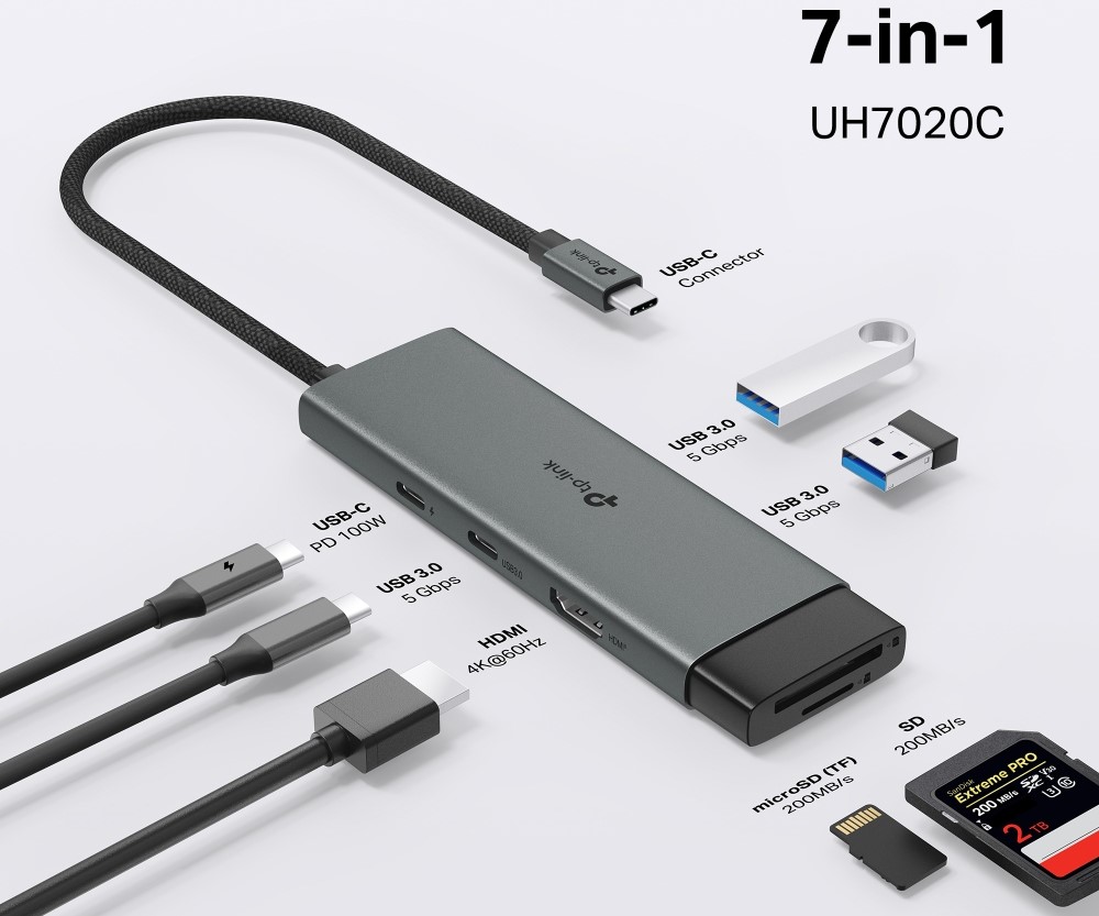 The TP‑Link 7‑in‑1 USB‑C Hub UH7020C transforms a single USB‑C port on your laptop or tablet into seven full‑function ports, including 4K@60Hz HDMI, 100W Power Delivery, an SD/microSD UHS‑I card reader, one USB‑C data port, and two USB‑A ports. It delivers ultra‑high‑definition video output to an external monitor, up to 200 MB/s card‑reader speeds for rapid photo and video transfers, and continuous 100W charging so you can work while powering your device without throttling. With 5 Gbps SuperSpeed USB 3.0 on all data ports and plug‑and‑play support across Windows, macOS, Linux, iPadOS, iOS, Android, and Chrome OS, the UH7020C is ideal for mobile workstations, content creators, and IT setups needing clean, multi‑device expansion from a minimal footprint.