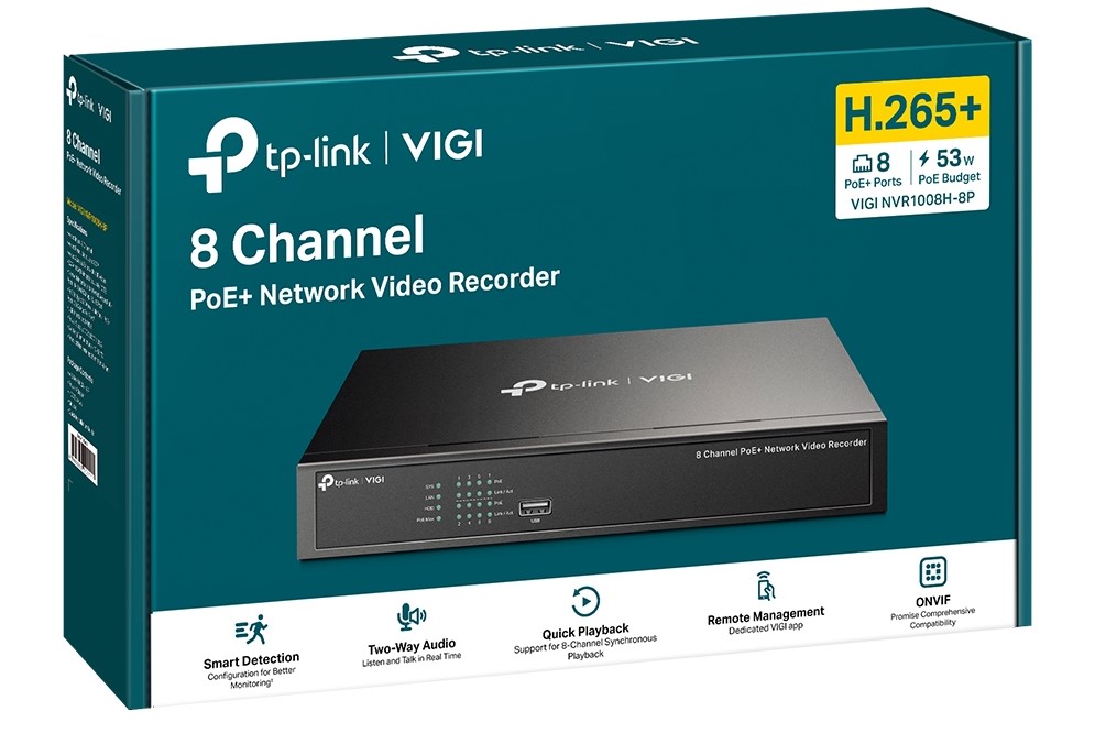 TP-Link VIGI NVR1008H-8P VIGI 8 Channel PoE+ Network Video Recorder – 4K HDMI Video Output & 16MP Decoding Capacity: Sharp image definition up to 8MP and an 8-channel display ensures you capture every detail, from every angle‡. Simplified Deployment with PoE+: Easily connect and power your PoE camera with one RJ45 cable transmitting both data and power. No power adapter needed. 8-Channel Simultaneous Playback*: Replay the feed from up to 8 cameras at the same time, increase replay speed, and find events in the video schedule to easily review footage. H.265+: Without using any extra bandwidth, your camera transmits compressed crystal-clear video to save disk space, ease network loads, and reduce monitoring costs without sacrificing image quality. ONVIF Ensures Compatibility△: Easily add IPCs from VIGI and other brands to establish a powerful and varied network thanks to barrier-free compatibility. Plug & Play: Allows new and unused VIGI IP Cameras to be added automatically to the new NVR and activated instantly, making installation faster than ever before. 24/7 Continuous Recording: Stores up to 10 TB of footage from connected cameras to secure your data for quick, convenient access. Remote Monitoring: The dedicated VIGI app, web UI, and VIGI Security Manager enable remote monitoring, providing ease and convenience. Flexible Installation: Choose the suitable installation method by simply housing your NVR on a rack, or placing it on or under a desk for greater convenience. Two-Way Audio: With voice intercom support, carry two-way conversations while watching your feed from anywhere. Suitable for management., Retail Box , 1 year warranty