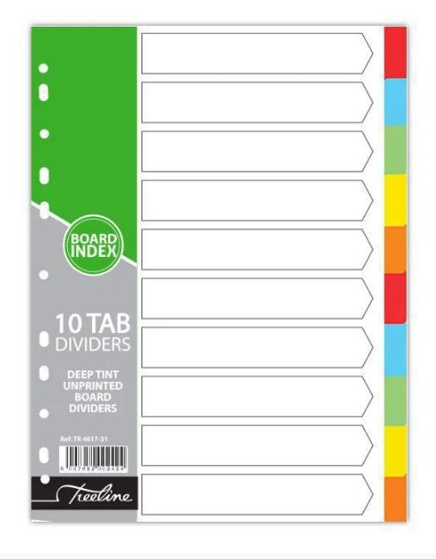 Treeline A4 160gsm Board File Dividers 10 Tab Bright Deep Tint Unprinted Not Numbered-(Tab 1-10),Retail Packaging, No Warranty