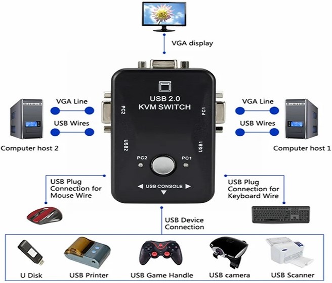 •Control 2 Computers with 1 keyboard, 1 mouse and 1 monitor.